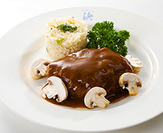 - 国産牛ハンバーグ牛窓マッシュルームソース
