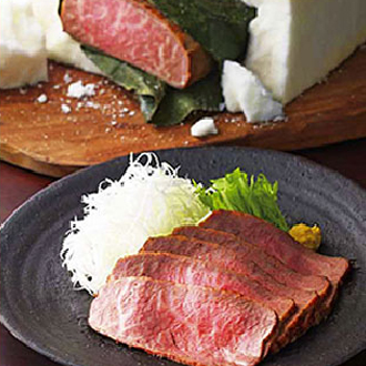 国産の黒毛和牛モモ肉を朴葉で包み、塩でまるごと包んでオーブンで焼きあげています。